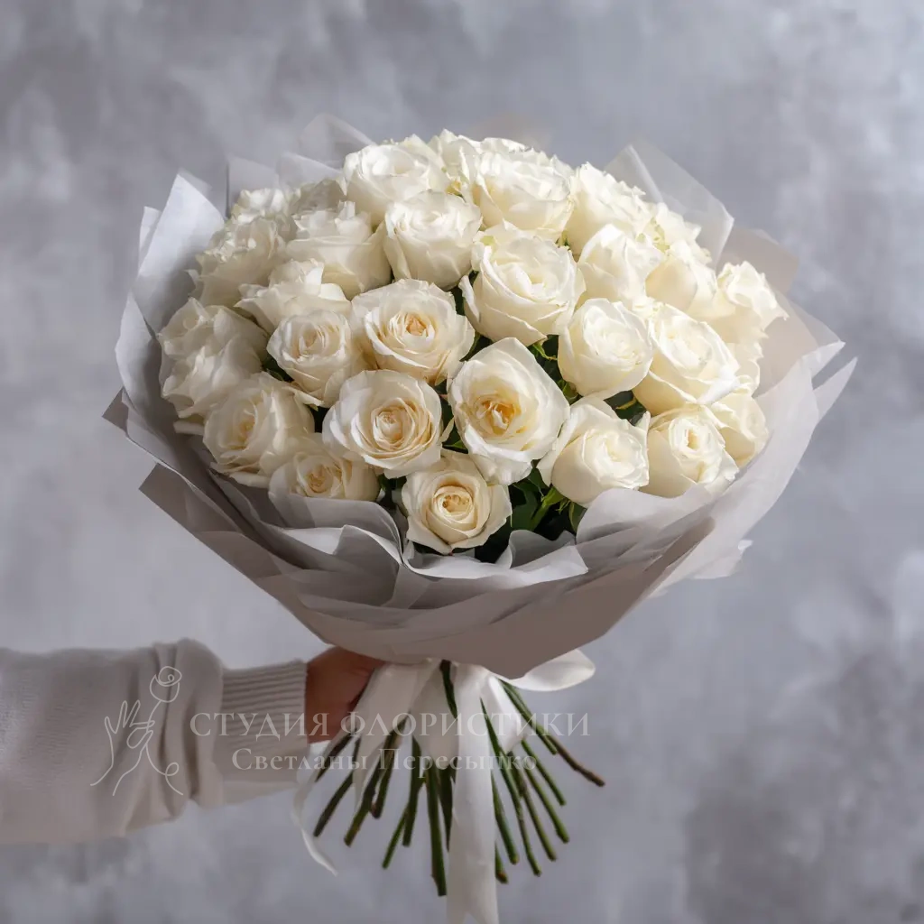 Белые розы в приглушённой палитре и упаковке цвета тумана — для создания атмосферы загадочности и элегантности. Такой букет говорит о глубине и осознанности чувств.
