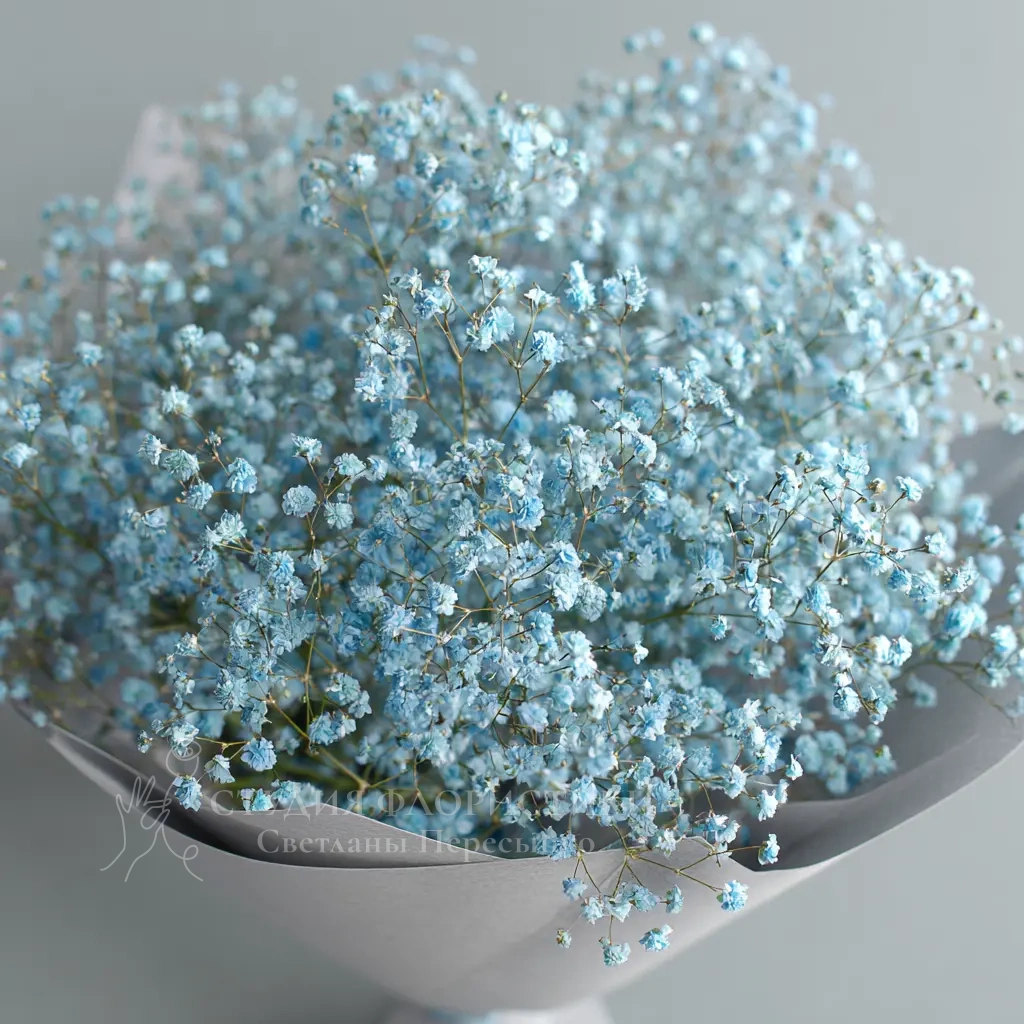 Современный и стильный выбор. Голубая гипсофила — тренд последних сезонов, отлично смотрится в фото- и видеосъёмках. Такой букет подойдёт как для молодёжных мероприятий, так и для оригинального комплимента.