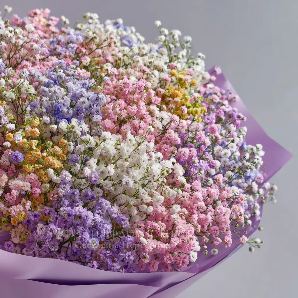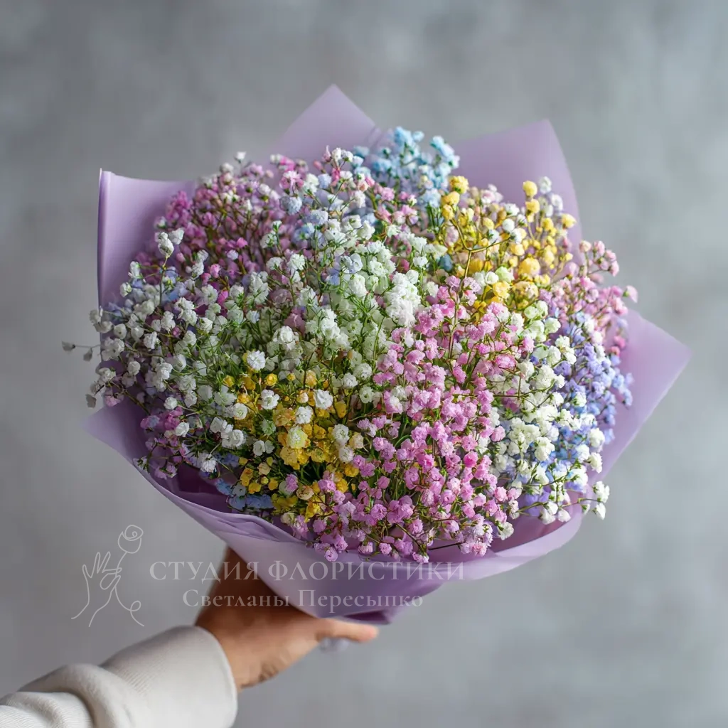 Богатая, объёмная структура создаёт ощущение цветочной волны. Гипсофила выглядит воздушно и динамично, а букет дарит настроение яркого торжества.