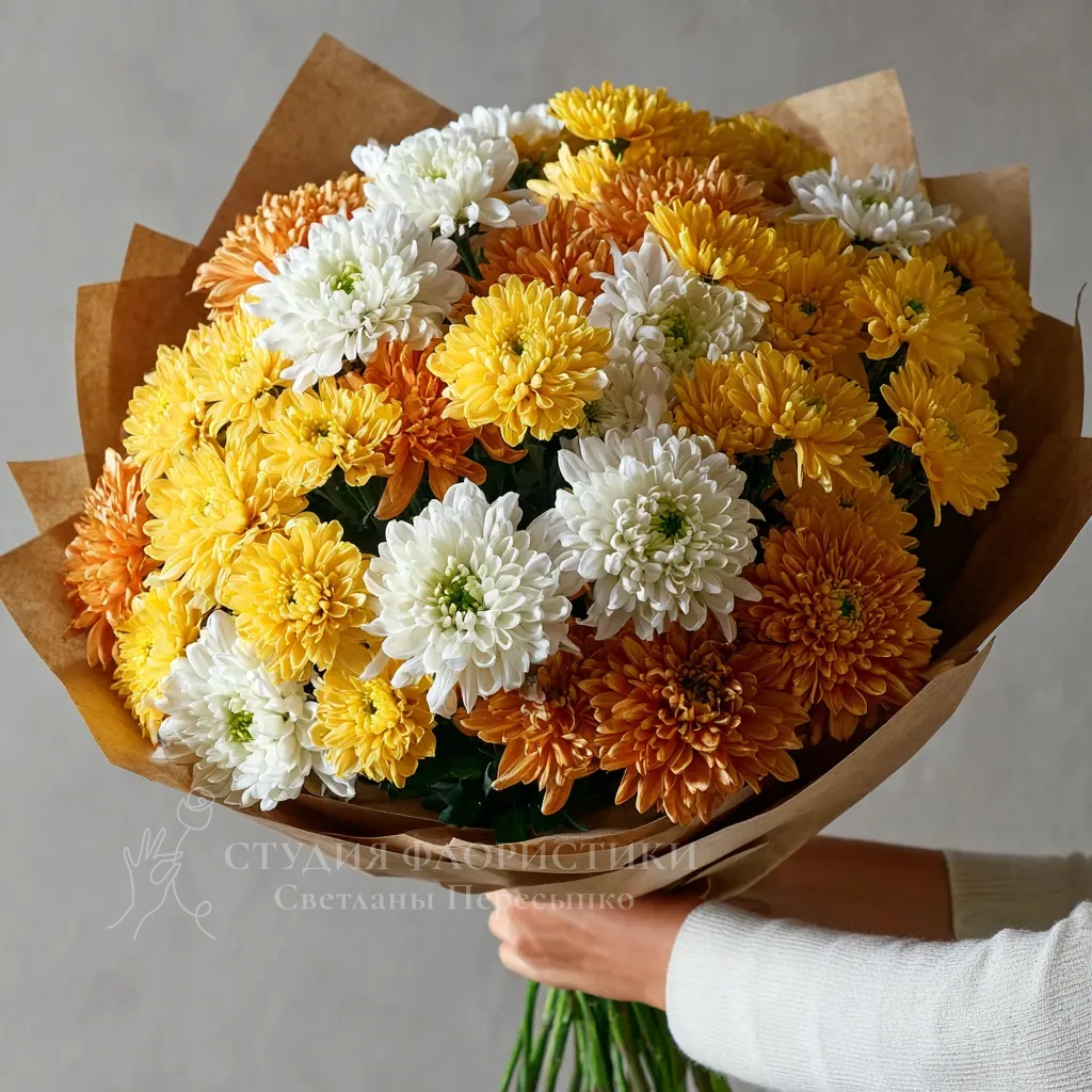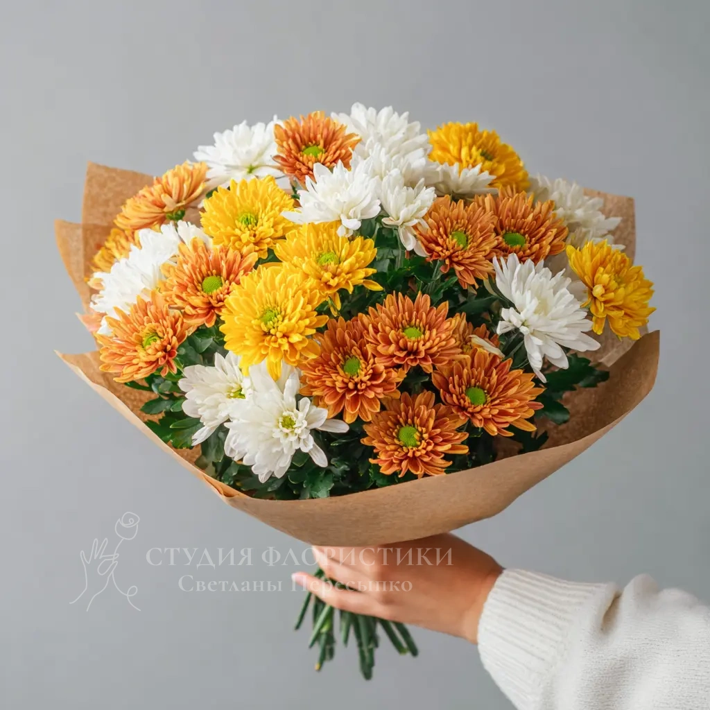 Оттенки белого, оранжевого и желтого делают этот букет настоящим отражением природы. Он словно собран в осеннем лесу и несёт аромат уюта и природной тишины.