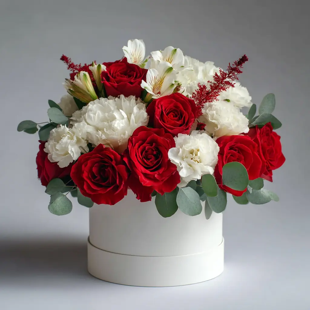Бордовые розы, белая альстромерия и астильба— стильная композиция для деловых подарков или интерьера.