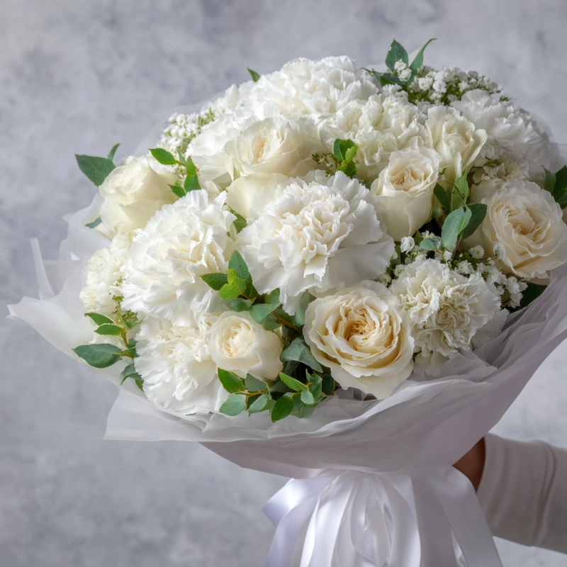 ГлавнаяКаталогБукетыГвоздикиБукет с гвоздиками «Белый вальс»