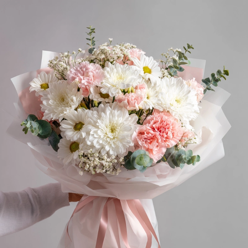 Яркий букет с гвоздиками и хризантемами, украшенный зеленью, идеально подойдет для праздника или чтобы поднять настроение близким.