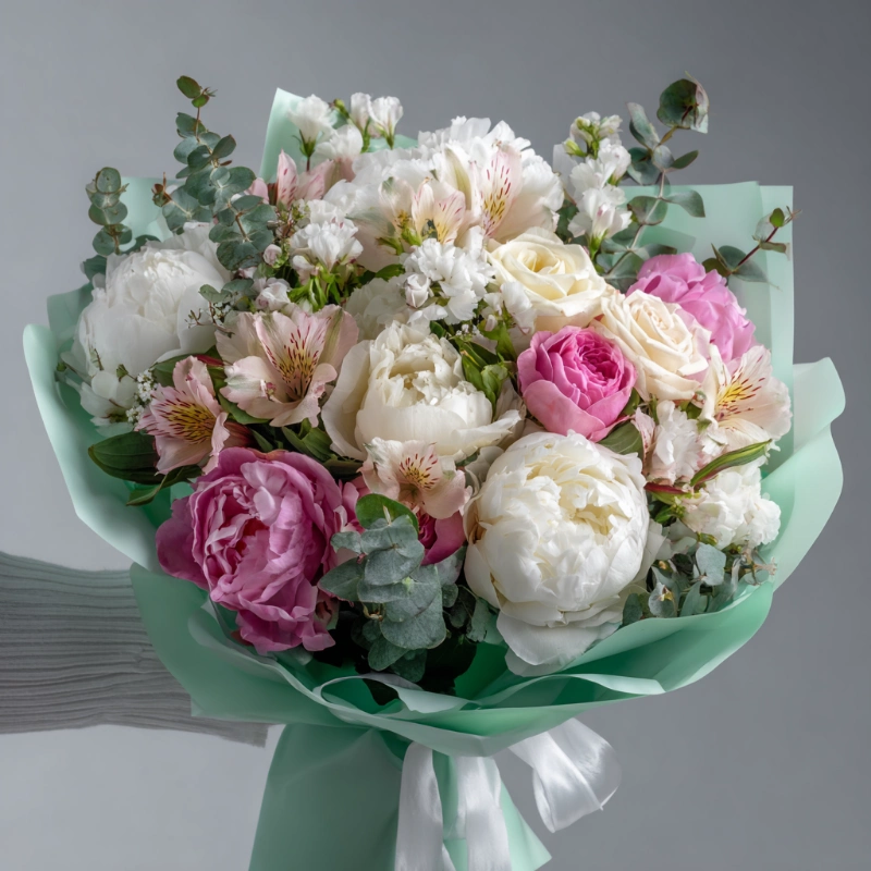 Воздушный букет из нежнейших пионов, словно облако в руках. Лёгкий, романтичный букет, который подходит для комплимента, свидания или фотосессии. Отличный вариант для поклонников минимализма и эстетики.