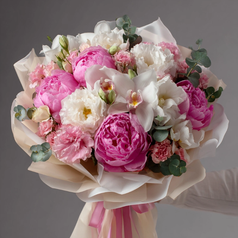 Утончённый букет с блеском и лёгким свечением. Пионы создают эффект перламутра, делая букет по-настоящему изысканным. Подходит для особых случаев и романтических сюрпризов.