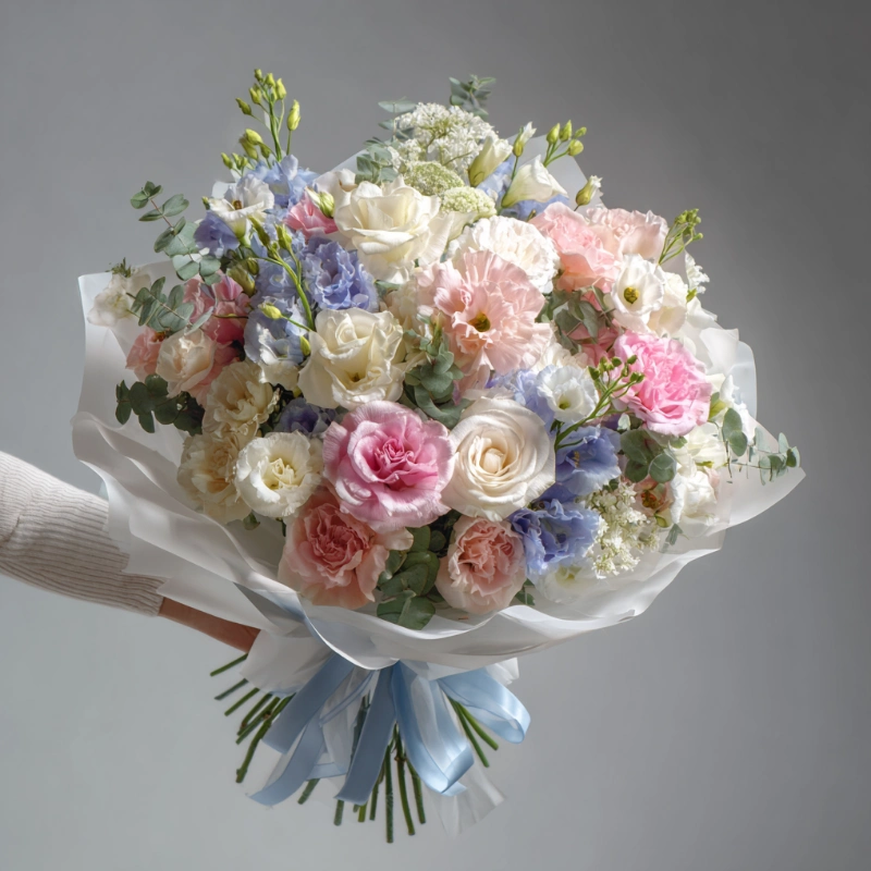 Свежий и чувственный букет с эустомами пастельных оттенков. Он словно вдох новизны — лёгкий, весенний, чистый. Прекрасен как для романтичного повода, так и для спонтанного знака внимания.