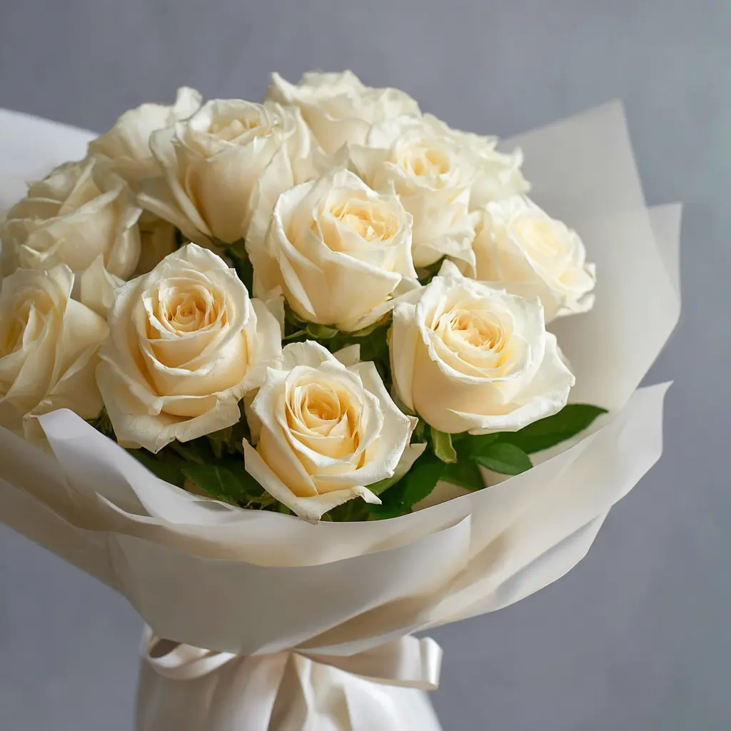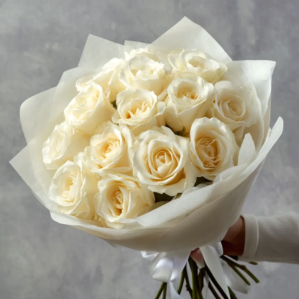 Невесомый и светлый букет из 15 белых роз высотой 40 см — символ чистоты и уважения. Идеален для официальных поздравлений, школьных мероприятий и трогательных моментов.