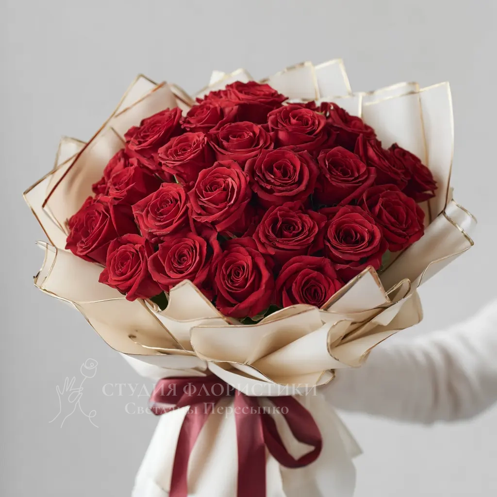 Глубокий рубиновый оттенок лепестков в сочетании с лаконичной упаковкой создают насыщенное, выразительное настроение. Идеален для торжественного признания в чувствах. Яркий акцент в романтический день.