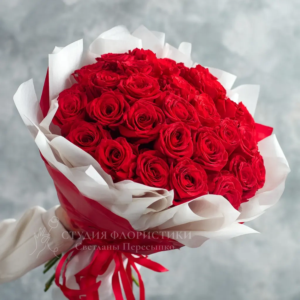 Элегантная композиция с насыщенными, карминовыми оттенками. Для женщин с характером и чувством стиля. Букет подчеркнёт уверенность дарителя и важность момента.